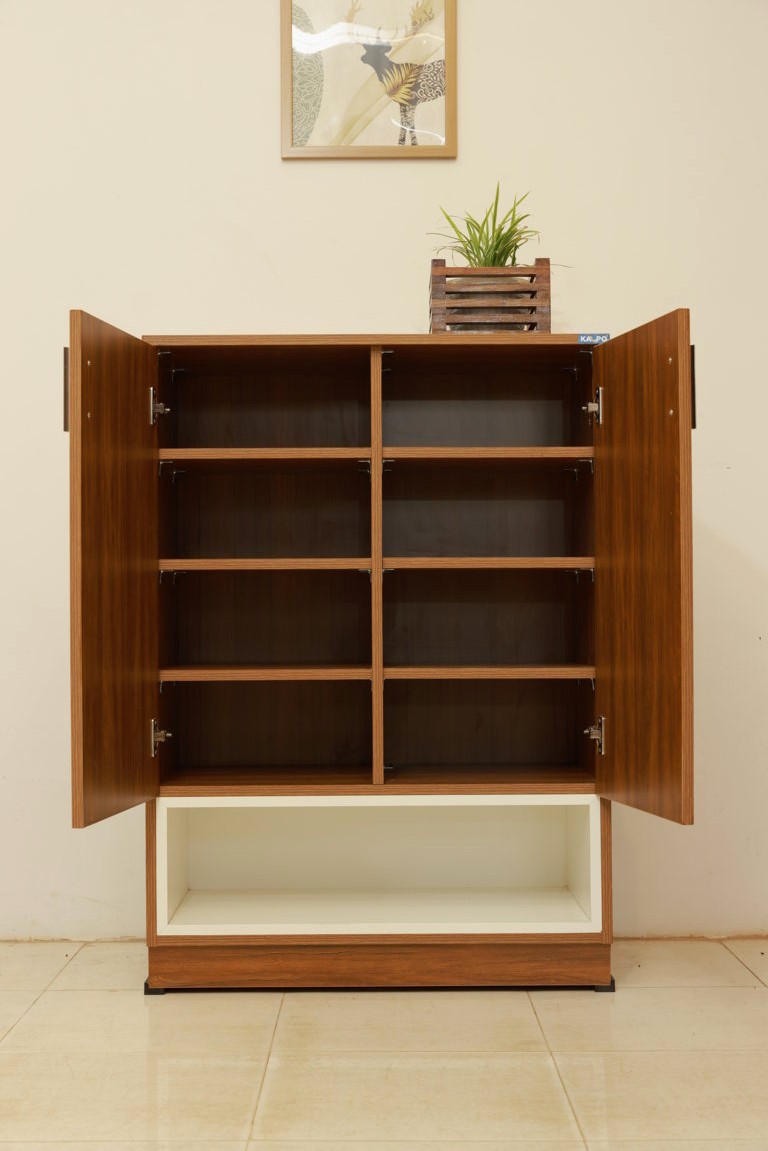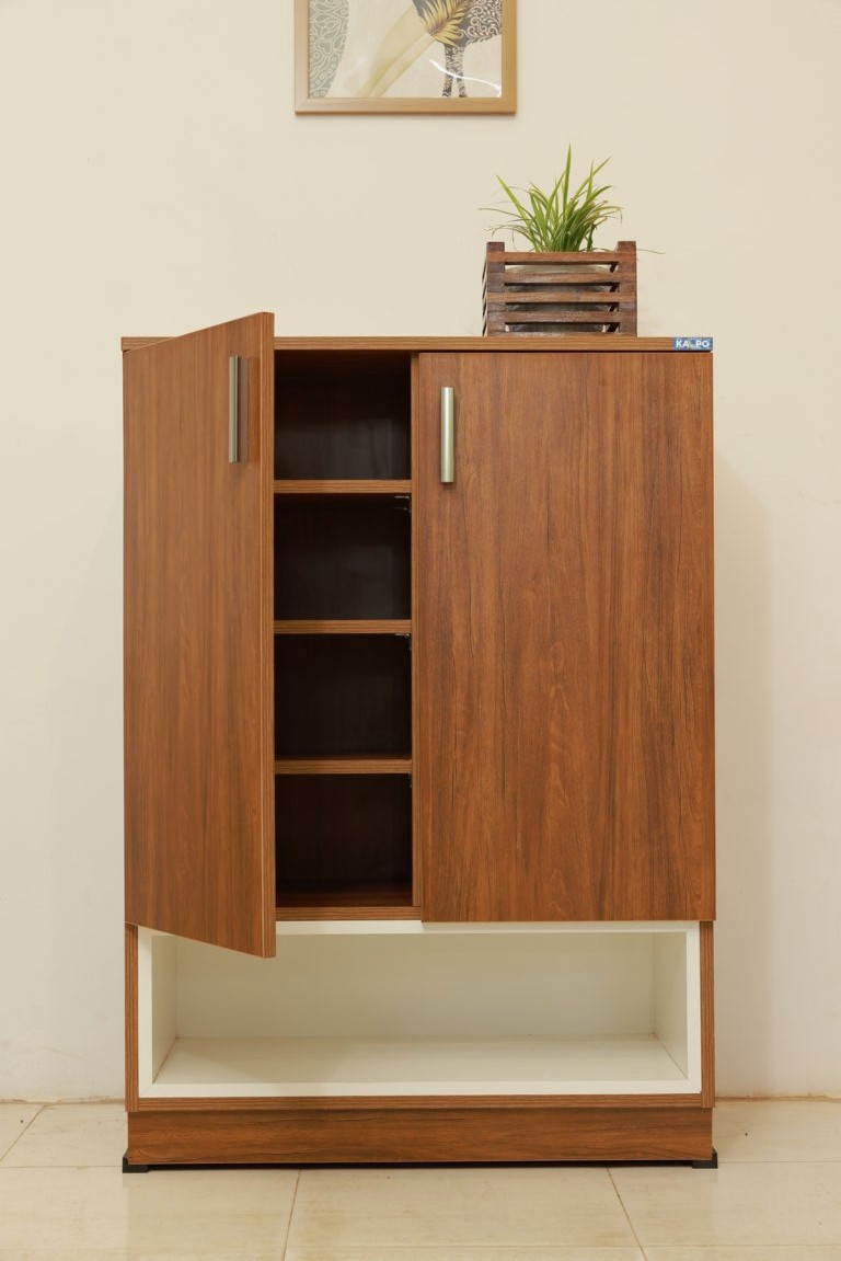 Audra is an elegant shoe rack features a rich wooden finish with sleek silver handles, blending style and functionality seamlessly. The spacious double-door cabinet provides ample storage to keep footwear organized and out of sight, while the open bottom shelf offers easy access for frequently used shoes. Designed for modern homes, its sturdy construction ensures durability, making it a perfect addition to entryways, hallways, or bedrooms. Complemented by a minimalistic design, this shoe rack enhances both organization and aesthetics in any space.