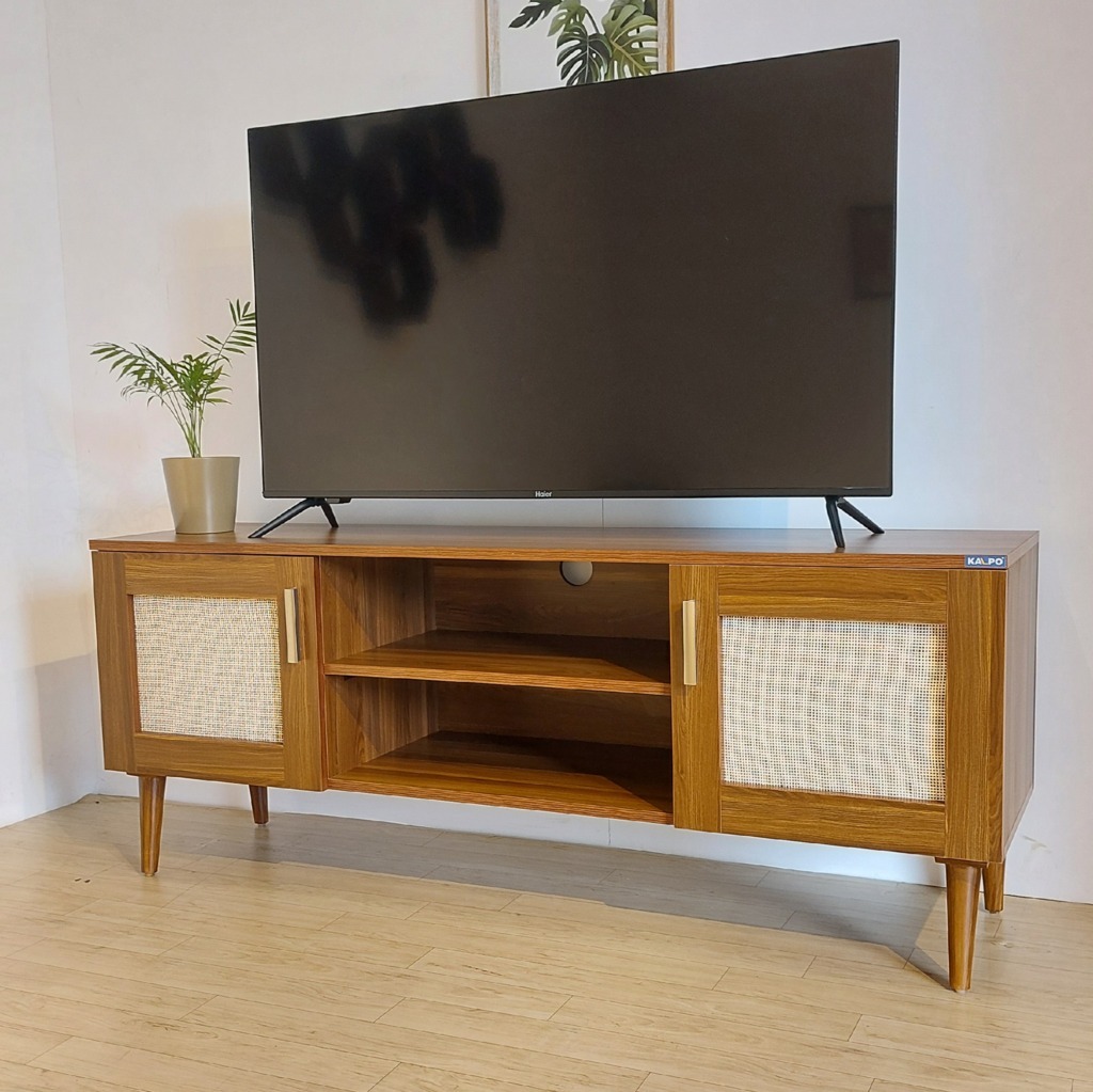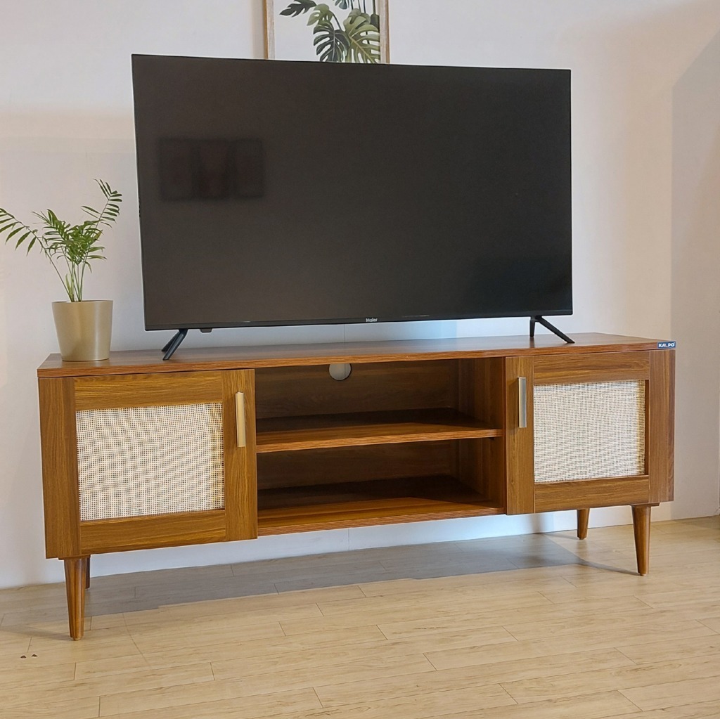 Aura Rattan TV unit combines natural charm with modern functionality, featuring a warm wooden finish and stylish rattan accents on the cabinet doors. It offers ample storage options, including two closed cabinets for concealed storage and open shelves in the center for media devices or decor. The cable management hole ensures a tidy setup, while the sleek metal handles and tapered legs add elegance and stability. With its versatile design and mid-century modern appeal, this TV unit is a perfect addition to any living space.