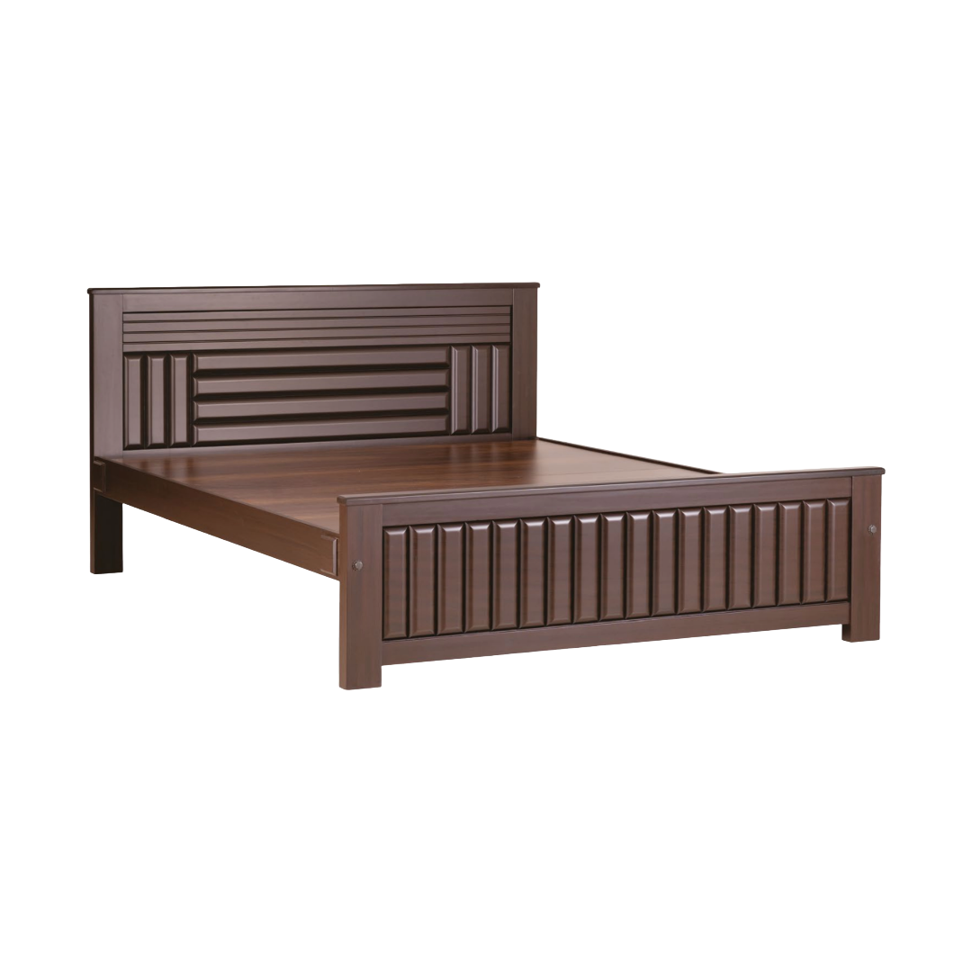 Enhance your bedroom with this elegantly crafted wooden bed, featuring a rich brown finish and a stylish grooved panel design on the headboard and footboard. Made from high-quality wood for durability, this bed combines modern aesthetics with sturdy construction, offering both comfort and sophistication to your space. Its spacious design ensures a restful sleep, making it a perfect addition to any contemporary or classic bedroom setting.