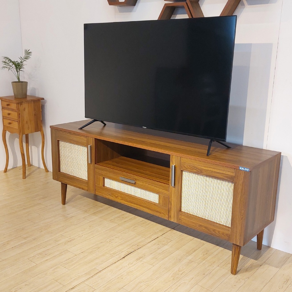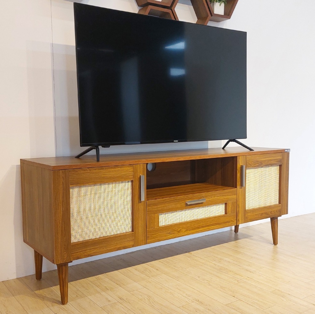 Classic rattan TV unit brings timeless charm to your living space, featuring a warm teak wood finish and woven cane panel accents. Designed in a mid-century modern style, this unit blends elegance with practicality. It includes open shelving for easy access to media devices, a spacious drawer for hidden storage, and closed cabinets to keep your space neat and organized. The tapered legs and sleek handles add a touch of retro sophistication, while the built-in cable management ensures a clutter-free setup. Perfect for TVs up to 65 inches, this unit is a stylish and functional centerpiece for any home.
