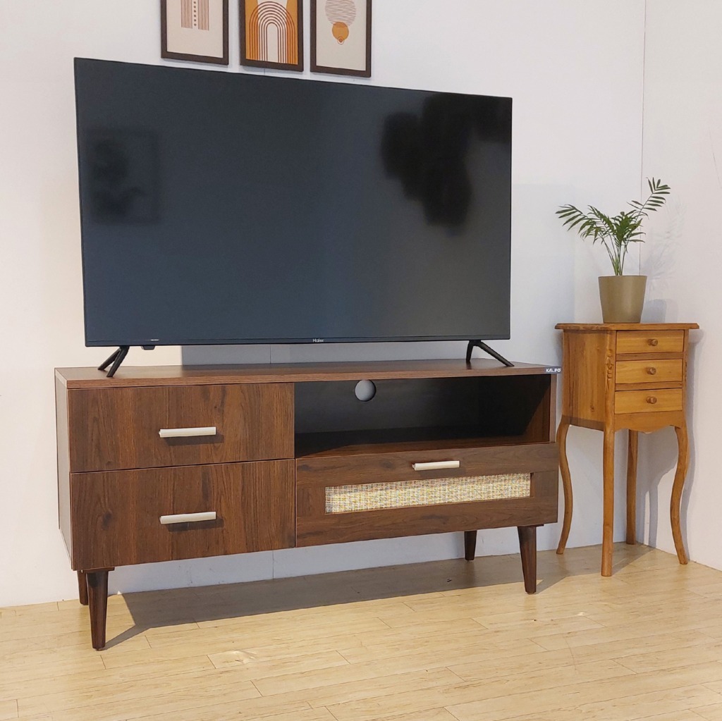 Elite Rattan TV unit is a modern TV unit featuring a sleek and minimalist design. Made from a warm wooden finish, it combines functionality with aesthetic appeal. The unit includes two spacious drawers on the left for concealed storage and an open shelf on the right for media devices, complete with a cable management hole for easy organization. The lower drawer features a stylish rattan panel, adding a touch of natural texture. Supported by angled, tapered legs, the unit has a mid-century modern vibe that complements a variety of home decor styles.