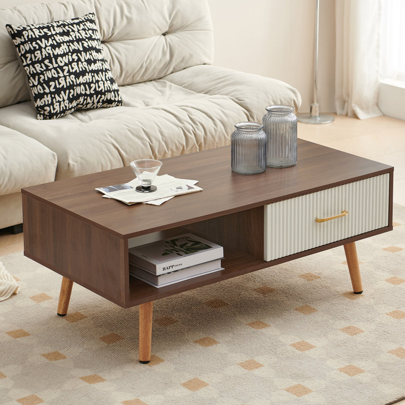 Eterna is a modern coffee table features a sleek walnut finish complemented by solid wood legs, offering a minimalist yet stylish addition to your living space. Equipped with a sliding drawer and an open storage compartment, it provides practical solutions for organizing books, magazines, or decor items. The white textured panel on the drawer adds a subtle design contrast, making it a perfect centerpiece for any contemporary living room.