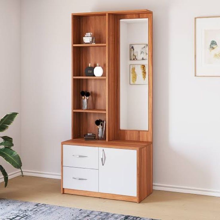 Koda dressing table features a modern design with a combination of warm wood tones and sleek white storage panels, making it a perfect addition to contemporary interiors. It includes a spacious full-length mirror, multiple open shelves for easy access to cosmetics and accessories, and a closed storage unit with drawers and a cabinet for organized storage. The sturdy build and elegant silver handles enhance its functionality and aesthetic appeal, making it an ideal choice for a chic and clutter-free dressing space.