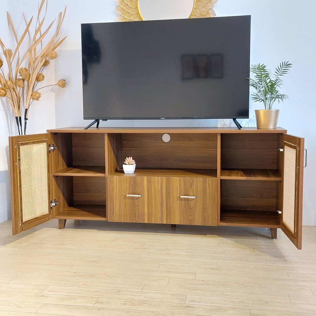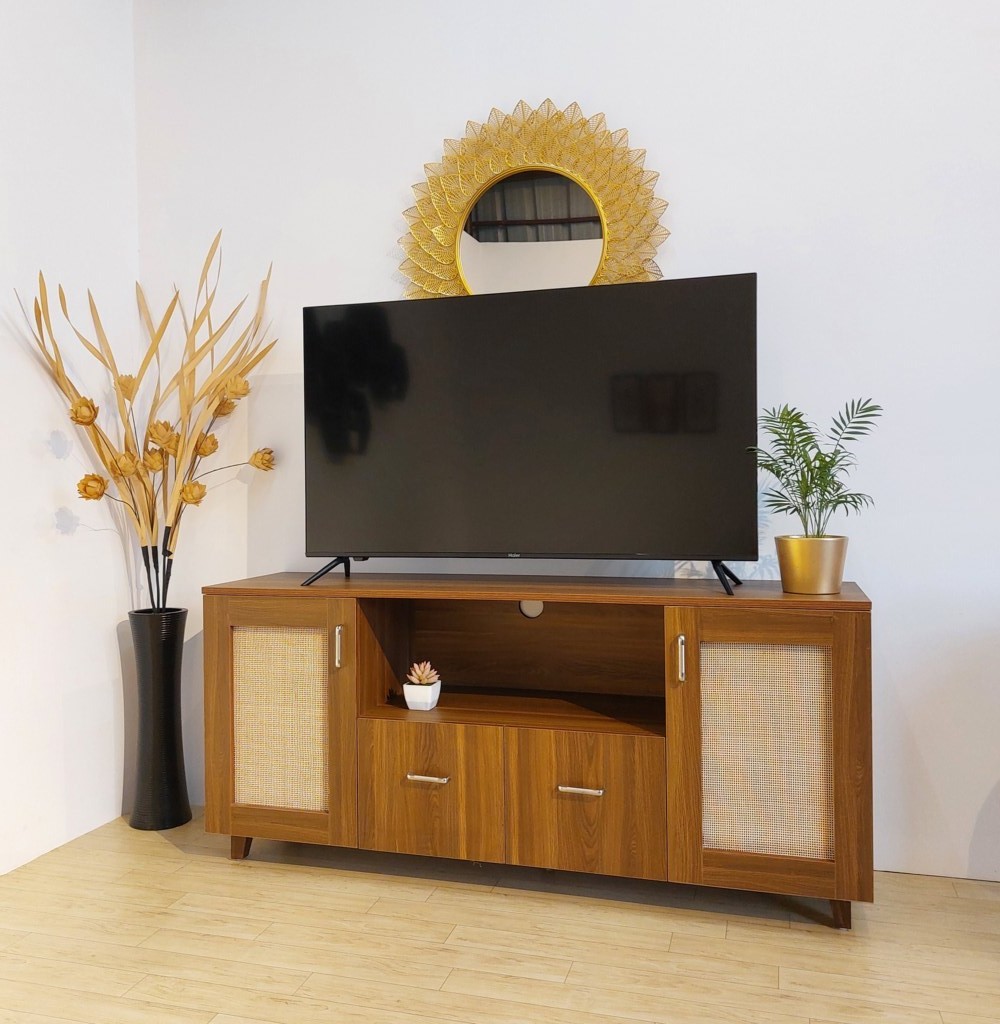 Marvel rattan TV unit combines a warm wooden finish with contemporary cane accents, making it a perfect addition to modern and bohemian interiors. Featuring a spacious design, it includes open shelving for easy access to media devices, concealed cabinets for clutter-free storage, and a cable management cutout for a neat setup. The sturdy build and clean lines ensure functionality with timeless style, while the compact yet practical layout makes it ideal for any living room space.