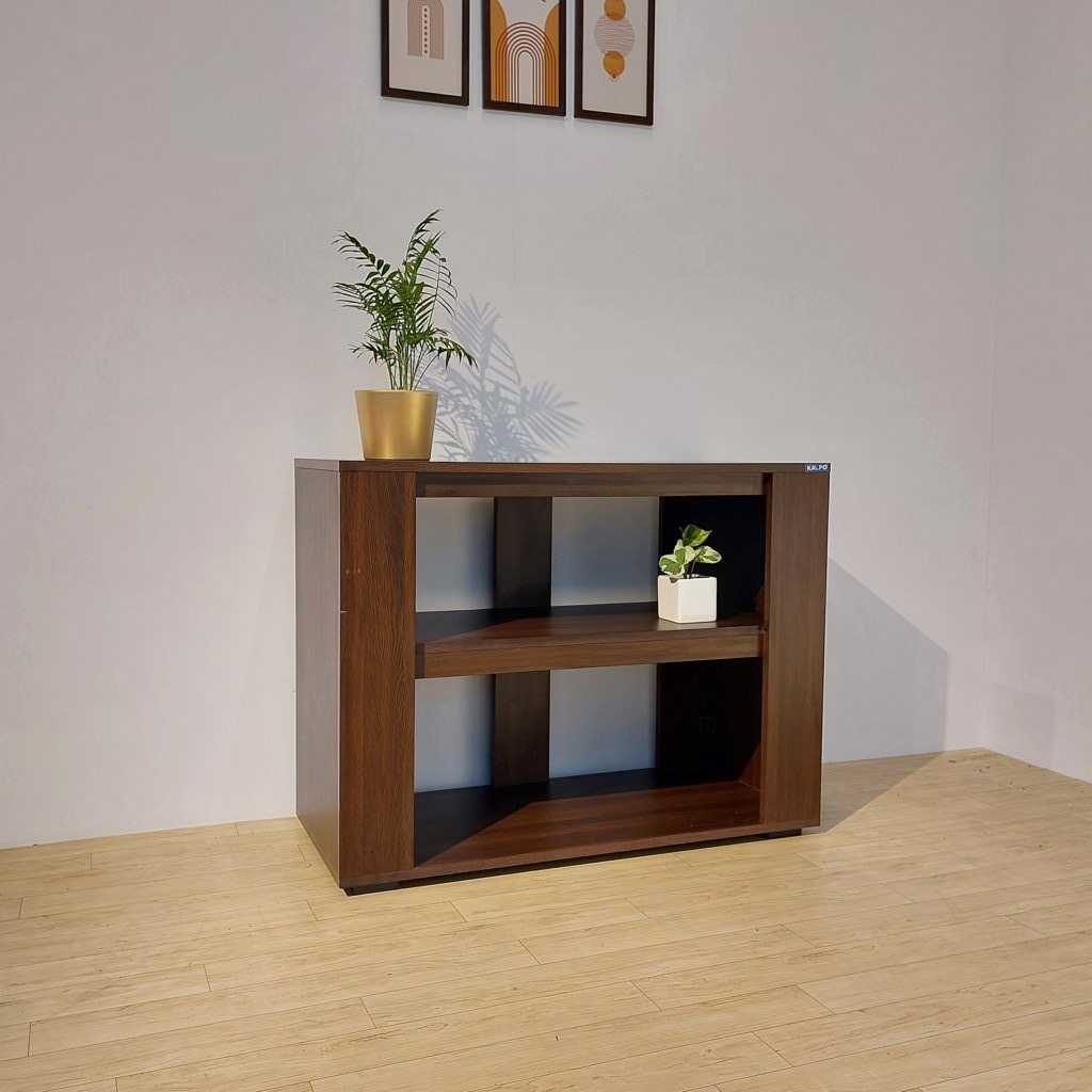 Minimal TV unit showcases a minimalist and open-shelf design, crafted from wood with a rich dark brown finish. Its simple yet functional structure includes three spacious shelves, perfect for organizing electronic devices, books, or decorative items. The open design allows for easy cable management and ventilation for electronic equipment. The unit is styled with small decorative elements, including a golden potted plant and a white planter, adding a subtle touch of elegance and greenery. Compact and versatile, this piece complements modern and contemporary interiors while offering practical storage and display solutions.