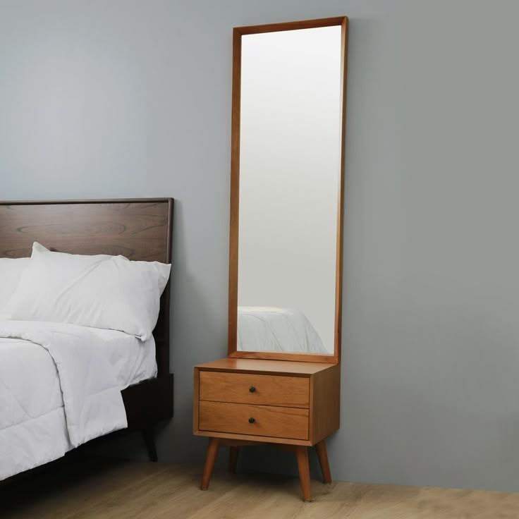 Rimac dressing table features a sleek, full-length mirror seamlessly integrated with a compact wooden storage unit, making it a perfect blend of style and functionality. Its mid-century design, highlighted by clean lines and tapered legs, adds a touch of elegance to any bedroom or entryway. The two spacious drawers provide ample storage for accessories, cosmetics, and essentials, while the rich wood finish enhances its timeless appeal. Ideal for contemporary and minimalist interiors, this dressing table is a chic and practical addition to any space.