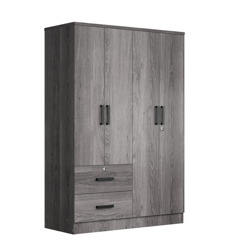 Slato 4 Door wardrobe features a sleek gray wood finish, combining elegance with functionality. Its well-organized interior includes multiple shelves for folded clothes or accessories, hanging rods for garments, and two spacious bottom drawers—one equipped with a lock for secure storage of valuables. The minimalist design, streamlined handles, and sturdy construction make it a durable and stylish addition to any bedroom, offering maximum storage in a compact and contemporary format.