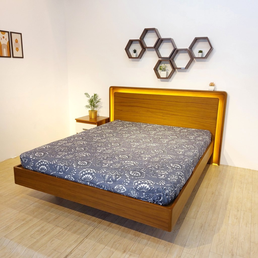 Transform your bedroom with this elegant, minimalist bed frame that blends modern aesthetics with timeless appeal. Crafted from wood with a natural teak finish, this bed features a sleek floating design, creating a spacious and airy look. The gently curved headboard adds a touch of sophistication and comfort, while its smooth edges and warm finish enhance the overall style. Paired with matching side tables for added functionality, this bed is perfect for modern and contemporary interiors. Durable, stylish, and easy to maintain, it is an ideal choice for those seeking a combination of beauty and practicality.