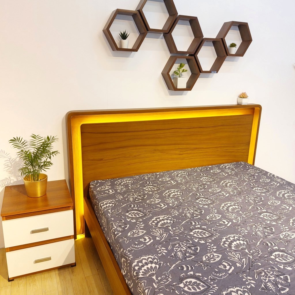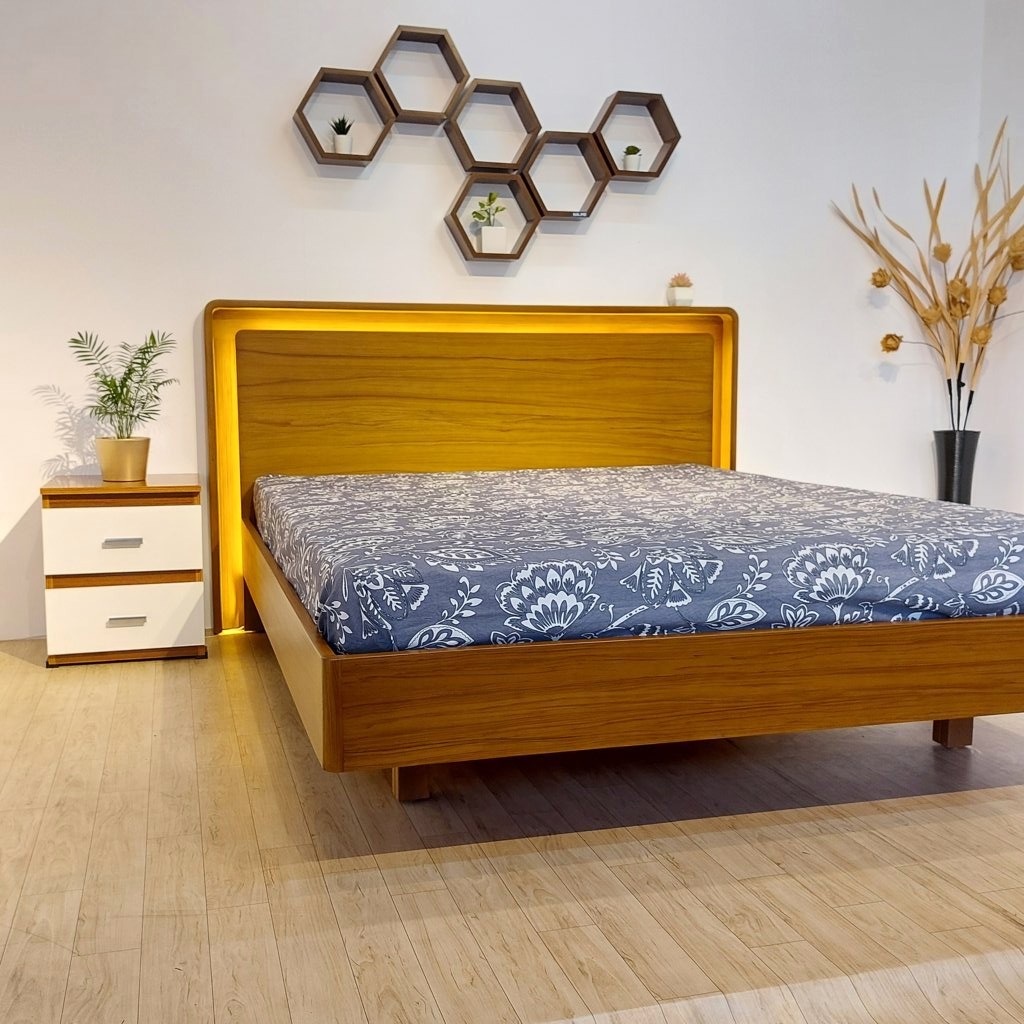• Stylish Headboard: Curved and smooth headboard with a rich teak finish for a sophisticated touch.